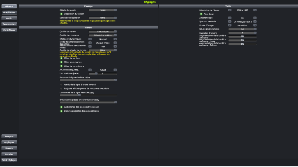 Les paramètres les plus importants sont dans l’onglet « graphisme ». Si votre machine a du mal à faire tourner le jeu, vous pouvez baisser les paramètres pour la soulager (comme les détails du terrain, la qualité du rendu et des textures, …). A vous d’essayer de baisser certains paramètres, puis en augmenter certains pour trouver un bon équilibre.