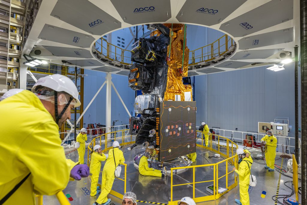 Tu peux remarquer que les équipes portent une drôle de tenue. La salle est en effet extrêmement propre pour éviter que de la poussière rentre à l’intérieur du satellite, ce qui pourrait l’endommager et l’empêcher de fonctionner correctement.